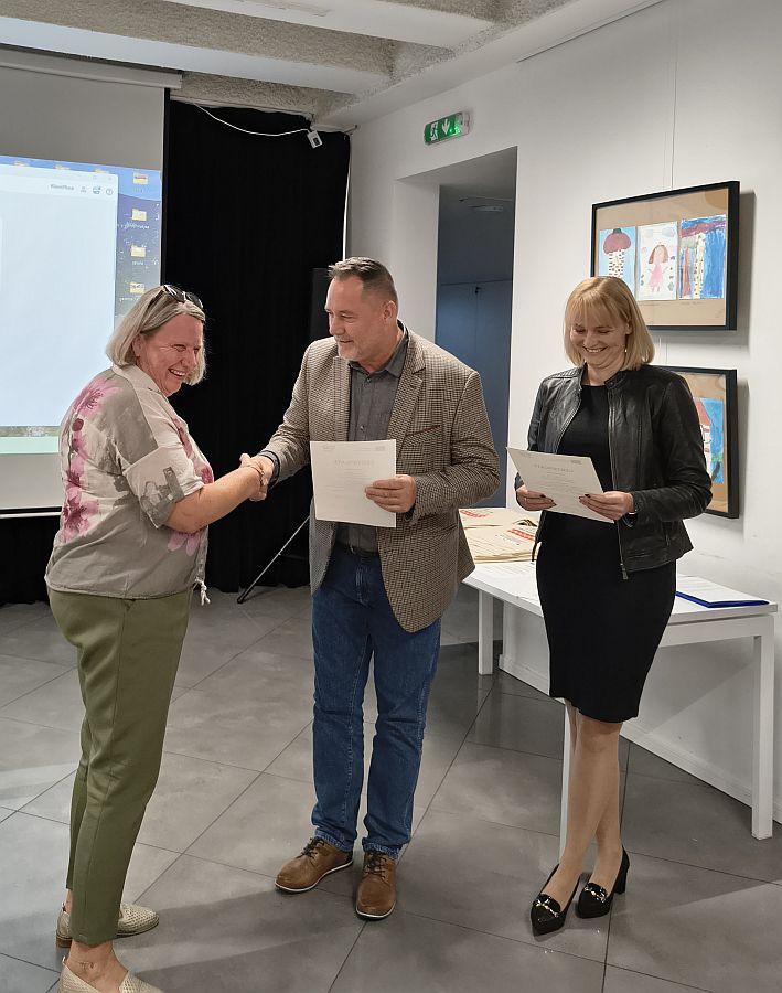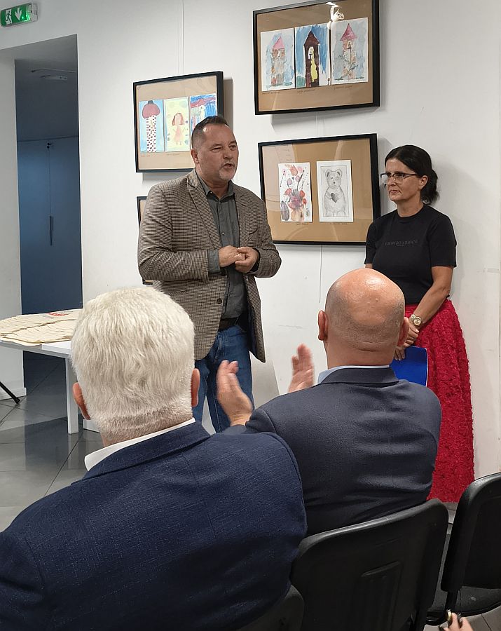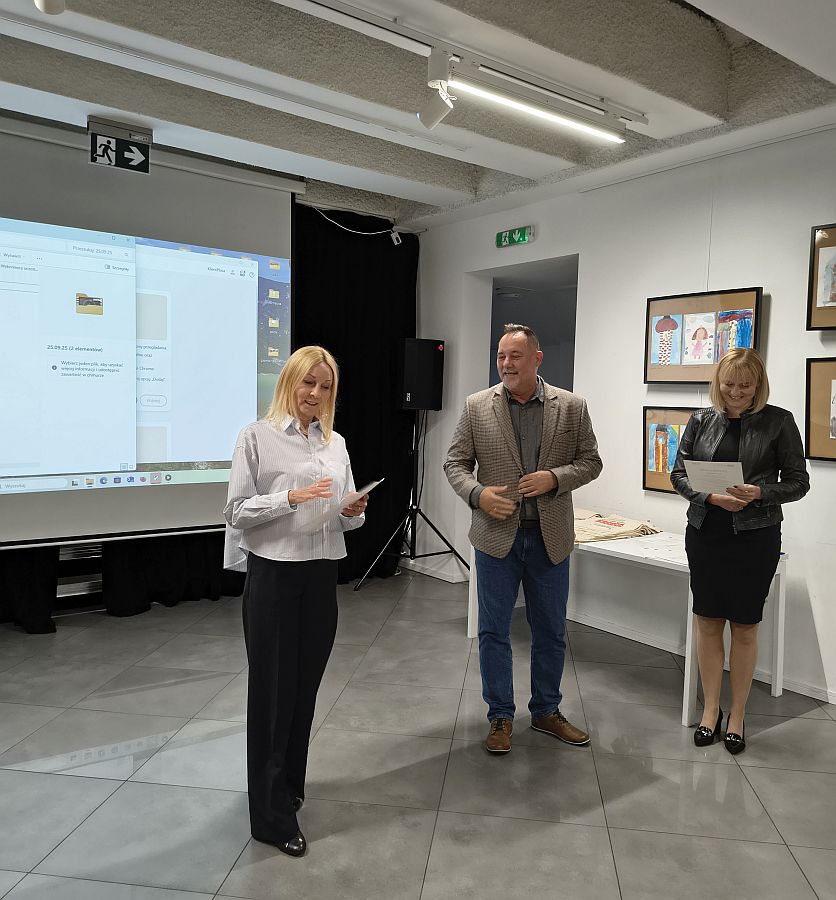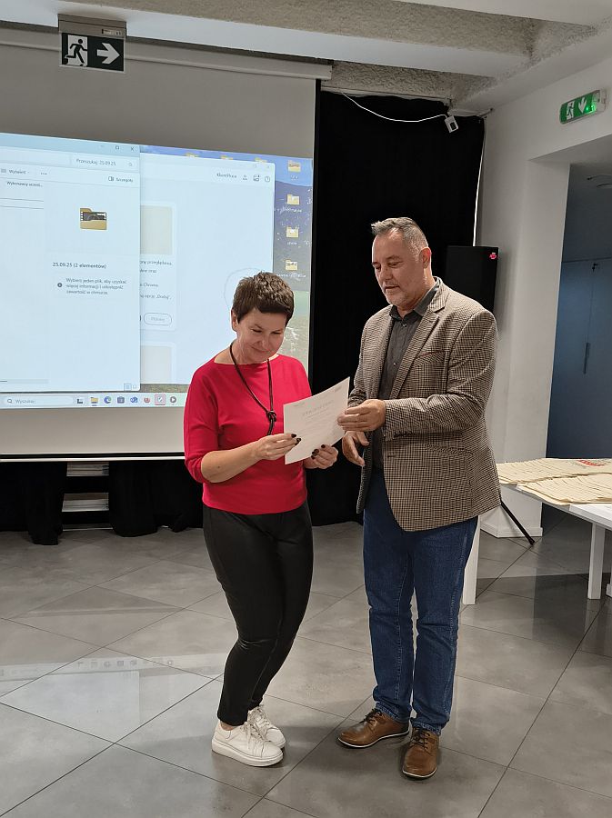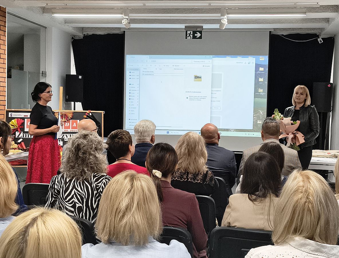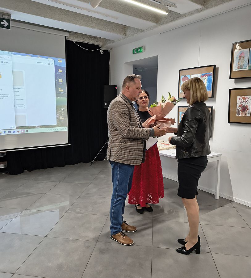 Dalszą część uroczystości poprowadził koordynator, który w swoim wystąpieniu przypomniał historię realizacji projektu, podziękował osobom zaangażowanym w jego organizację i współpracę oraz wręczył podziękowania i certyfikaty uczestnikom. Szczególne wyróżnienie i kwiaty otrzymała Agnieszka Zając z Fundacji InCrea, która wspierała szkołę na każdym etapie przedsięwzięcia.
